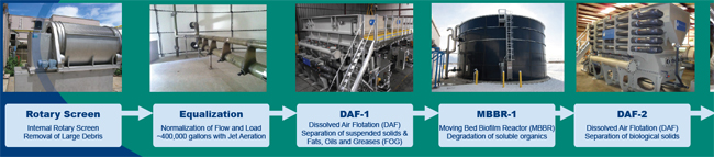 To meet discharge and pretreatment requirements at one of its manufacturing facilities, KanPak had installed a traditional biological wastewater treatment system, including a biological process and a secondary DAF. The system included an interceptor/pump station; equalization tanks; aerobic fixed film bio treatment; secondary solids separation; DAF with flocculation tank; compressor/pressure tank; sludge dewatering; vertical rotary screw press; and a final effluent flow/pH monitoring.