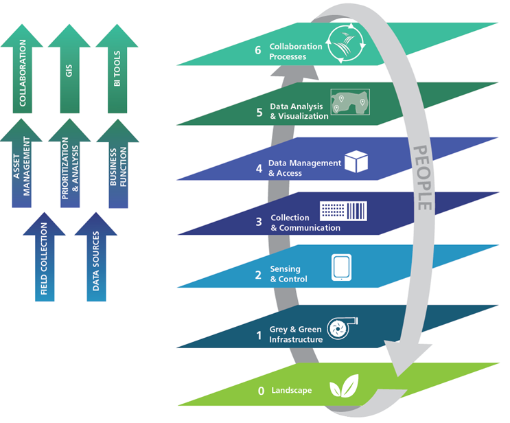 The Clean Water Services Knowledge Development Model (KDM), shown in Figure 2, was inspired by the SWAN Interactive Architecture Tool and helps explain how water industries can leverage the IoT to develop valuable knowledge about their watershed. Digital Solutions started from Layer 2 to Layer 5. Collaboration between District staff and partner agencies and organizations are captured in the highest level of the KDM. Internal and external stakeholders from across the watershed work together to understand engineered and natural systems and measure the effectiveness of the organization’s current practices and initiatives. A deeper knowledge of the watershed is developed from the effect of District efforts and are repeatedly measured and re-evaluated by stakeholders. Over time, this knowledge becomes foundational to the continued improvement of the organization’s operations and business towards watershed health.
