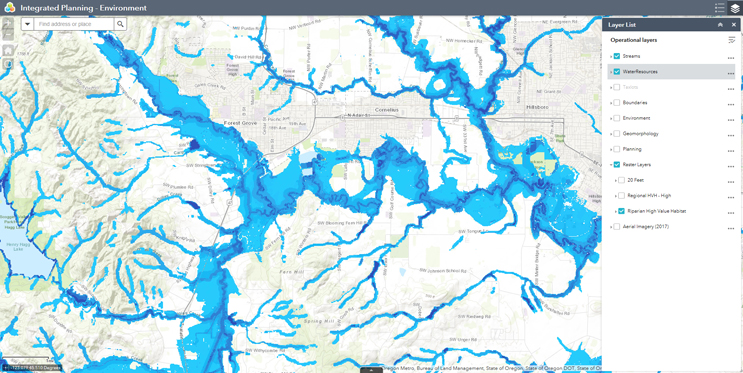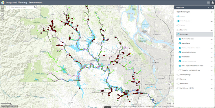 GIS data management, analysis, and visualization are distributed within the District. Digital Solutions ensures that GIS databases and software are up-to-date and working for users, integrates GIS with other business systems, automates data processing workflows, and may assist with some data import and management tasks. GIS analysts typically work within their departments to perform in-depth data analysis and reporting, create geographic products, and import and manage datasets specific to their user bases. To better achieve holistic watershed management, an integrated planning portal was developed to overlay information related to geomorphology, environment, and engineering planning perspectives from multiple sources. It is designed to be easily adapted to new requirements, broadly accessible to District users for integrated planning strategy and watershed assessment, and flexible enough to allow addition of information needed by planners and decision-makers.