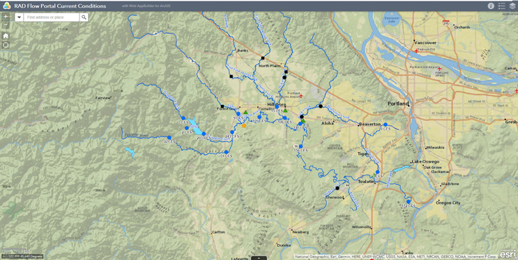The culture change has produced more efficient and holistic results. Dark data started to become uncovered and leveraged to provide more value for Clean Water Services. For example, the initial use of sewer system monitoring is to inform sewer cleaning and sewer replacement capital projects. Through collaboration, the use of data has been extended to our Source Control group to provide real-time flow data to track slugs of flow discharged from industries and inform wastewater treatment and recovery operations to prevent upsets. In addition, a stream flow portal (Figure 1) was developed integrating real-time flow sensor data, plant SCADA data, and water storage information to serve as a communication tool that summarizes the information used to manage stream flow and illustrate how Clean Water Services provides ecological uplift through flow management in the Tualatin River. The technologies used to achieve this were custom integration processes written with Python, ESRI’s ArcGIS Enterprise to build mapping services and applications, and Microsoft SQL Server used as the back end for data storage. The custom integration process’ data sources include iHistorian for wastewater treatment facility (WWTF) effluent, SharePoint for reservoir withdrawal and tributary flow augmentation information, and real-time flow sites supported by United States Geological Survey (USGS) and the Oregon Water Resources Department (OWRD). To further unleash the potential of this data, it is also used to inform decisions on tributary flow augmentation, wastewater operation optimization, and stormwater real-time control facilities. Maps and services allow users to view river flows, releases from reservoirs, tributary stream flow augmentation, and effluent volume from treatment plants, as well as a calculation of what percent of flow is from each source.