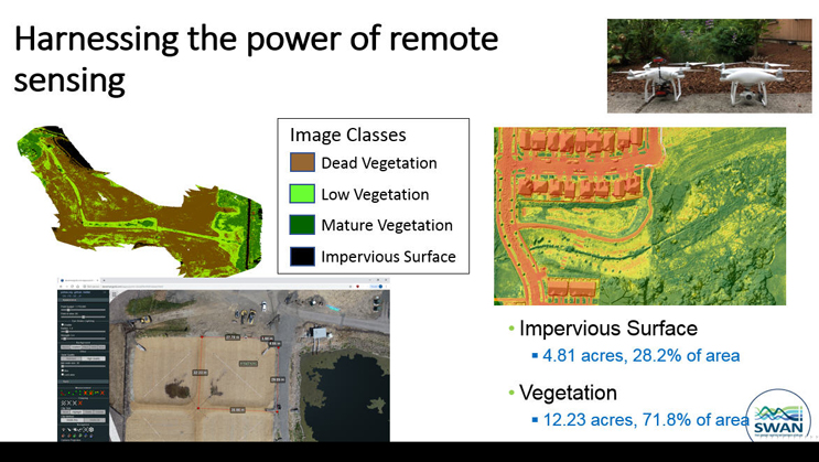 Since 2007, CWS has begun exploring the use of remote sensing technologies, including Lidar and unmanned aircraft systems (UAS) with multi-spectral imagery to guide stream restoration project planning, construction, and maintenance for watershed management. Compared with the traditional densiometer approach to measure project shade, the use of remote sensing technologies provides more consistent and accurate measurements of stream restoration project performance (Figure 5). In addition, UAS technology allows for the monitoring of additional project-specific information, including stream storage, soil moisture information, impervious surfaces, and invasive species control. This big data introduced from imagery analysis opens a new era of watershed characterization with quantitative and granular information on a watershed scale to aid integrated planning efforts and develop cost-effective solutions. Today, the District staff is exploring using machine learning and open source tools to harness the power of data analytics for watershed monitoring and generate granular information about land use for watershed management.