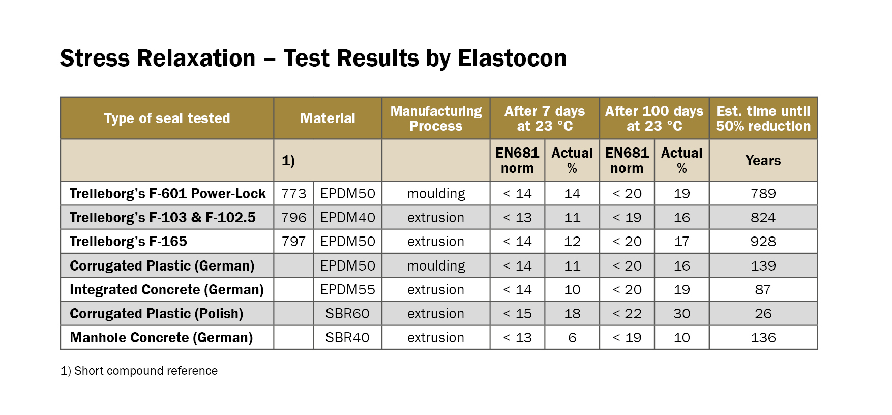 A leading independent ‘stress relaxation’ test has determined that the average performance lifetime of some of Trelleborg’s key pipe sealing compounds is in excess of 800 years. Elastocon AB, a global leader in testing stress relaxation in elastomers, found that Trelleborg’s elastomeric compounds remain within the acceptable 50% relaxation threshold significantly longer than rival solutions – more than seven centuries longer, in most cases.