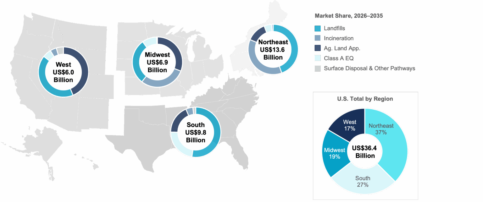 As biosolids management options tighten nationwide, regional disparities in disposal capacity and regulation are reshaping municipal spending patterns across the U.S. Bluefield forecasts that the Northeast will account for US$13.6B—more than one-third of total U.S. municipal biosolids spending through 2035—as competition for limited landfill and incinerator space intensifies. In the Southeast, rising landfill tipping fees and continued population growth will drive spending to US$9.8B, or 27% of the national total. Across the Midwest and West, land application remains more accessible but faces mounting logistical challenges and growing local opposition.