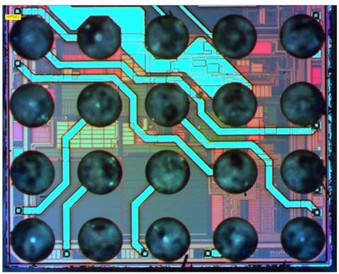 The ASIC contains millions of circuits on an area of about 2.5 x 2.5 millimeters. The solder points (grey-blue circles in the picture) provide the contact between the chip and the electronics of the pressure transmitter.