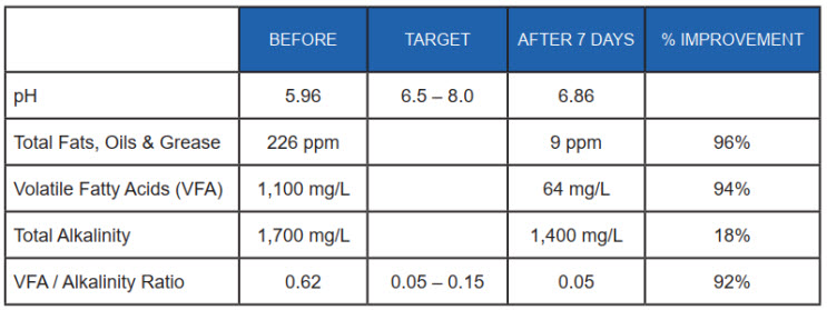 Enzymes were dosed into the digesters and circulation pumps were run for a few hours daily. The improvements achieved within seven days are shown below.
