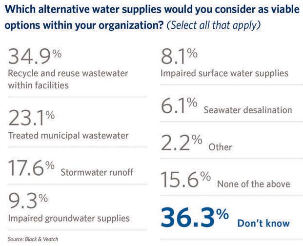 Of the nearly 900 utilities surveyed, 35 percent said they consider on-site recycled and reused wastewater to be the most viable option for reducing their water footprint. Treated municipal wastewater ranked second (23 percent), followed by stormwater runoff (18 percent). More distant workable options include impaired groundwater supplies, impaired surface water supplies, and seawater desalination, all supported by less than 10 percent of respondents (Figure 1).