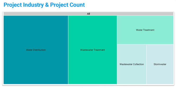 Figure 1: A breakdown of smart water projects by their larger industry. Water distribution is the largest segment, with smart meter and leak detection projects leading the pack.