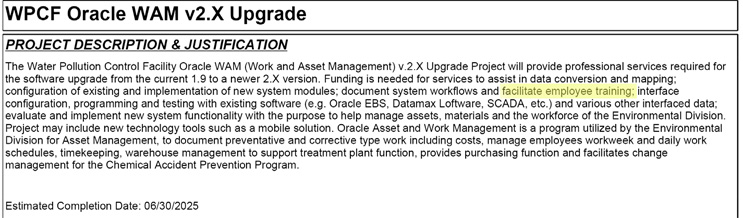Figure 3: A snippet of text from a Nevada capital improvement plan (CIP) outlining software spending at their Water Pollution Control Facility, which will include an element of employee training.